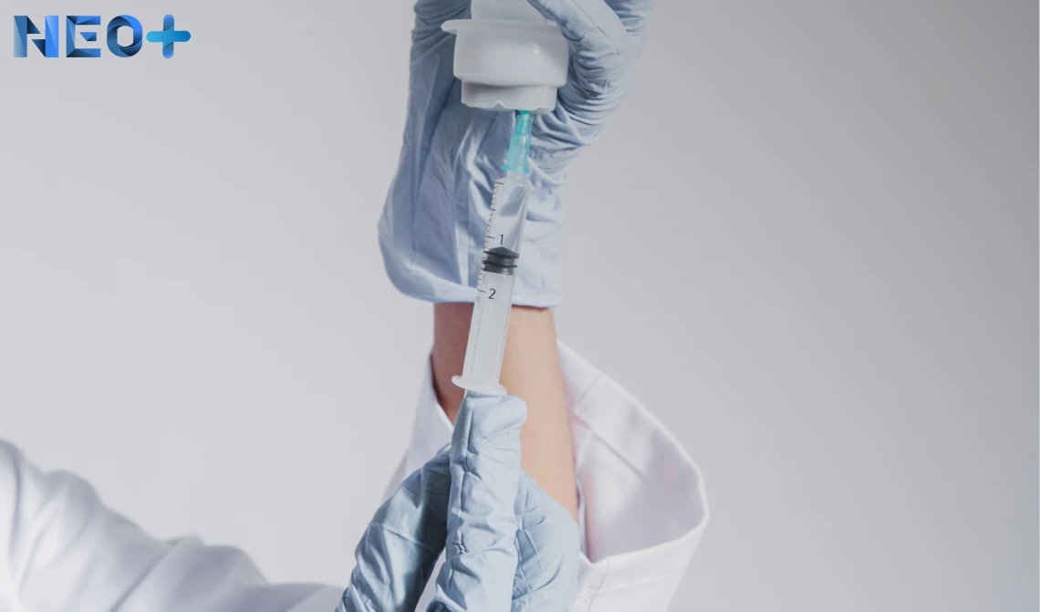Врач перевернул сосуд с лекарством и вводит его в шприц